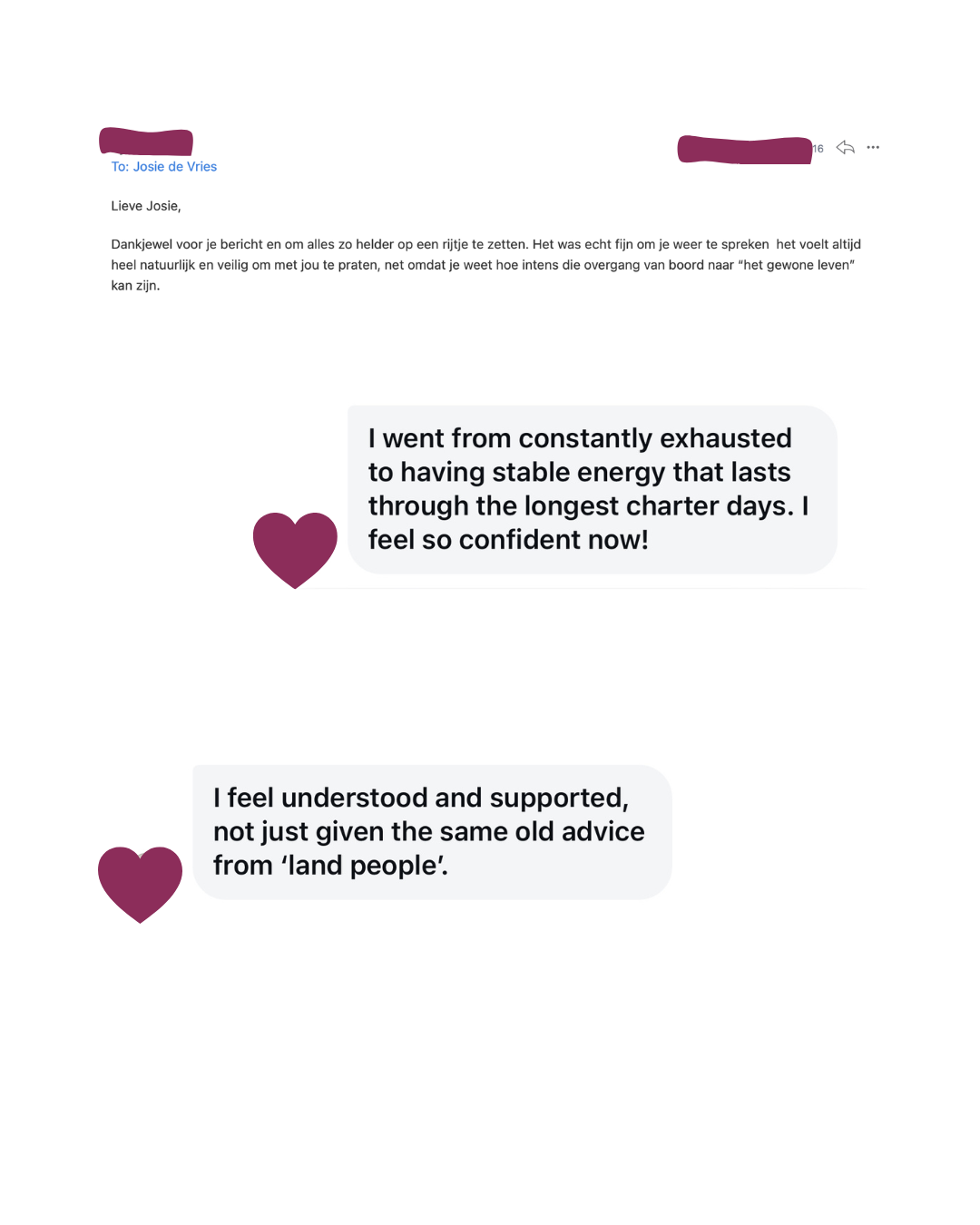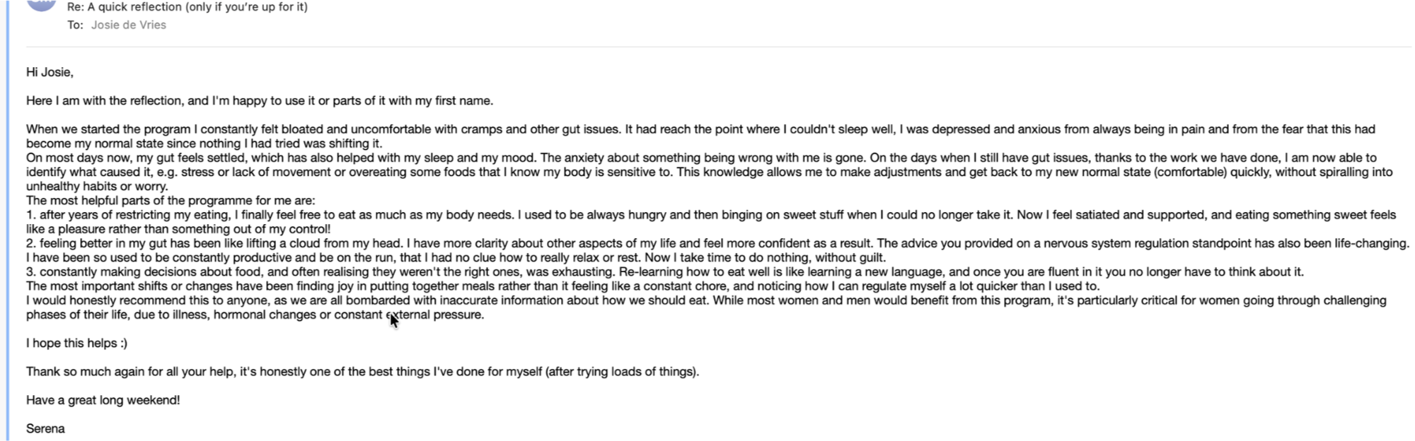 I don't do generic protocols. I don't hand you a meal plan and disappear. I work with a small number of clients at any one time precisely because this kind of work requires real attention — reading your patterns, adjusting as you go, being genuinely available when things come up.